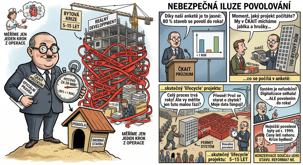 Česká debata o bydlení a stavebnictví dostala v posledních dnech nový, na první pohled optimistický impuls. Podle průzkumu ČKAIT se totiž „80 % staveb povolí do jednoho roku“ a „polovina dokonce do šesti měsíců“. V zemi, která čelí jedné z nejhorších krizí dostupnosti bydlení v moderní historii, by to byla zpráva téměř revoluční. Jenomže není. Je to vlastně šíření poplašné zprávy.